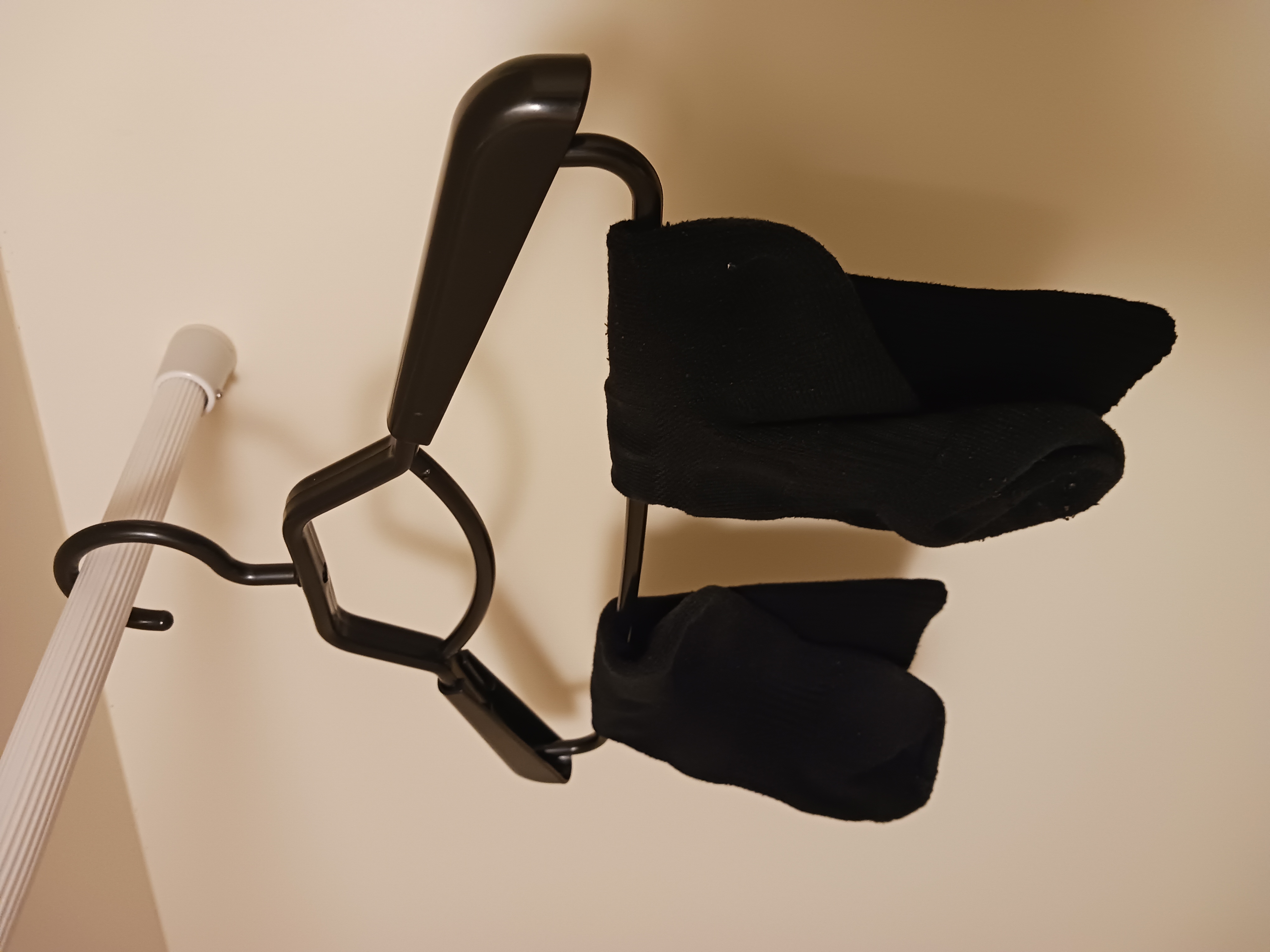 下着類は二つ折りにしてそのままハンガーに吊るし干します。靴下も同様二つ折りにしてハンガーに吊るし干しますが、内側の部分が乾きにくくなります。特に靴下は分厚いので 数時間おきに反対にすることをおすすめします。また、私は、吊るしたまま乾燥できる衣類乾燥機を使っているので数時間おきに反対にする手間がありません。(この衣類乾燥機も 紹介できればしたいです)そして、これらも乾いたらそのままクローゼットに収納しています。もちろん、下着・靴下類を畳んで収納してもらっても大丈夫です。 ただ、超時短したいという方はそのハンガーに吊るしたままクローゼットに収納でも工夫の一つだと思います。