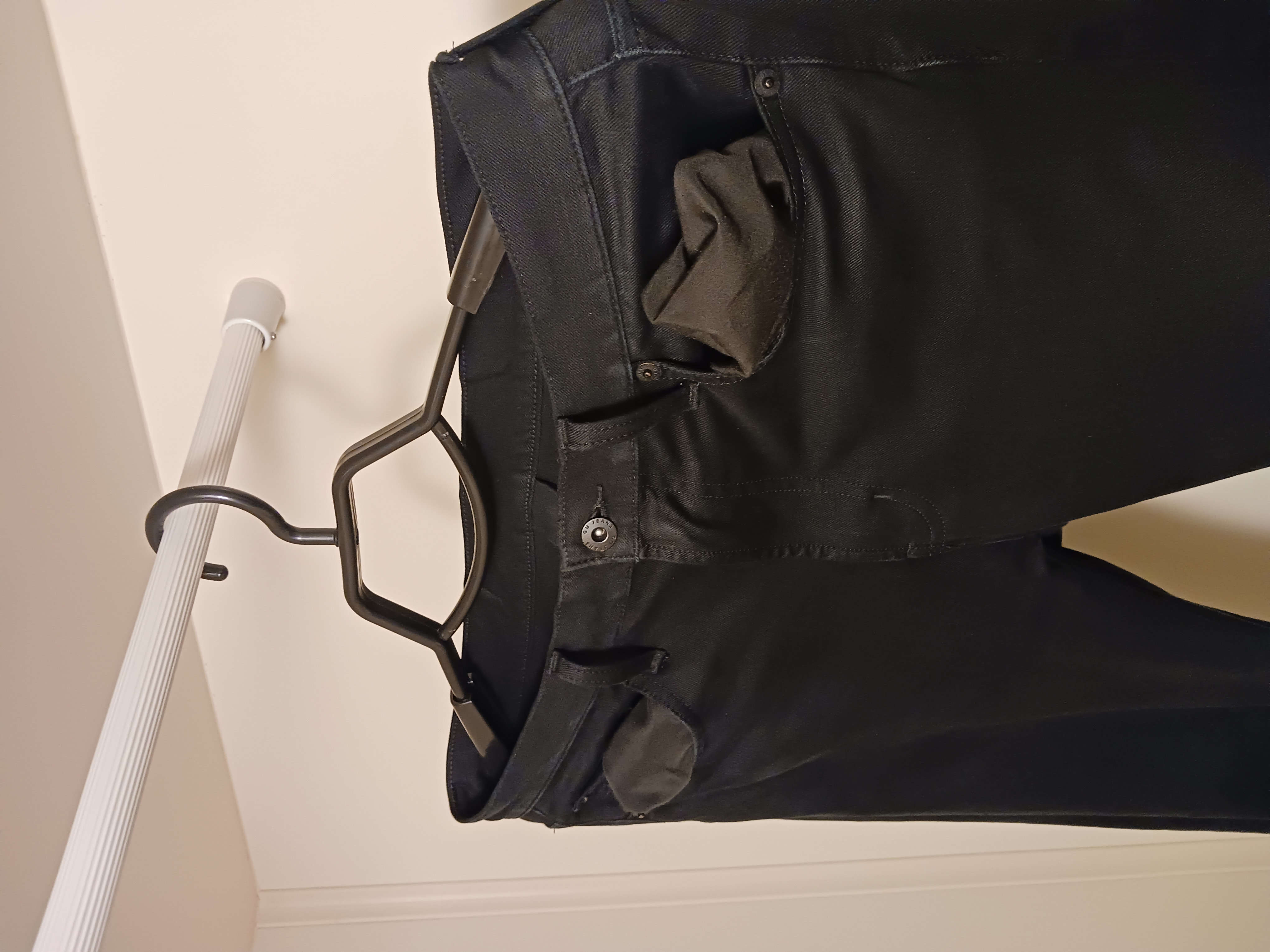 ここで、ズボン類の干し方が気になるところですが、私のやり方では 横幅が伸縮するハンガーを用いてそのままズボンの開口部に差し込み、吊るせるところまで伸縮部を伸ばし干しています。そして、良く乾かすためにポケットの内側の生地も外に出したり して工夫しています。このように干すことによって空気に触れる表面積が増えて乾きやすくなりました。普通はピンチハンガーで吊るして干すと思いますが、洗濯バサミの跡がついたり 吊るされているところだけ伸びたりして不快感がありました。なので、このような干し方にしています。